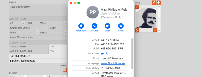 Manchmal ist es praktisch Kontakte, die in einem CRM-System gespeichert sind, auch auf einem Computer z.B. als Apple-Kontakte pflegen zu können. Das Modul base72 Kontakte bietet diese Möglichkeit in Form einer Schnittstelle, die es erlaubt Apple Kontakte zu verwalten.