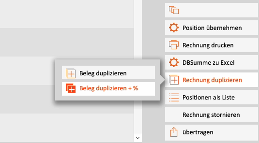 Wenn Sie also in Zukunft eine Rechnung erstellen und Preise anpassen wollen, können Sie dies gleich beim Duplizieren der Rechnung tun. Navigieren Sie dafür nur wie gewohnt zu „Rechnung duplizieren“, mit einem Klick erscheint ein Pop-Up Fenster und Sie können wählen, ob Sie die Rechnung mit oder ohne Erhöhung duplizieren wollen.