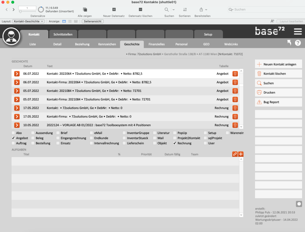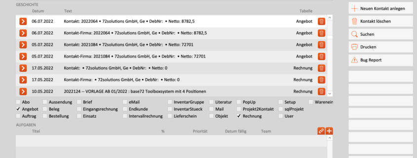Wenn Sie mit base72 arbeiten, erzählen Sie dem Programm nämlich automatisch eine Geschichte über Sich und Ihre Kundschaft. Suchen Sie also im Kontaktmodul eine bestimmte Firma oder Kundschaft und klicken auf den Reiter „Geschichte“, erhalten Sie eine komplette Kontaktchronik. Ein Filter ermöglicht Ihnen die schnelle Suche nach allen möglichen Dokumenten. So können Sie mit zwei Klicks alle Angebote und Rechnungen, die Sie diesem Kontakt bereits geschickt haben, gegenüberstellen.
